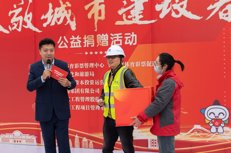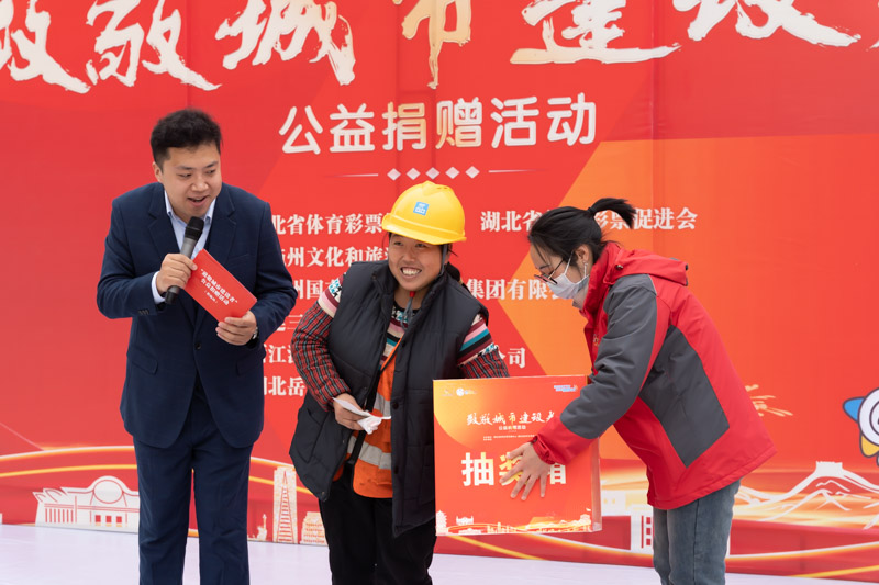 在捐贈活動現(xiàn)場,湖北省體育彩票管理中心與湖北省體育彩票促進(jìn)會為廣大建設(shè)者捐贈了冬衣。在“送彩頭”的體彩沙龍互動環(huán)節(jié),工人們現(xiàn)場刮起頂呱刮彩票,感受體彩的公益性和娛樂性;活動還設(shè)置了抽獎游戲環(huán)節(jié),為建設(shè)者們送去豐厚的獎品,抽獎環(huán)節(jié)緊張、刺激、歡樂的氛圍,使繁忙的工人們感到輕松愉悅;湖北體彩優(yōu)秀代銷者代表也自發(fā)地參與到這次公益捐贈活動中,現(xiàn)場向工友們捐贈保溫杯,用實(shí)際行動踐行體彩人的公益精神;活動還特邀湖北體彩公益形象大使、2022年央視《星光大道》年度總冠軍——土家稀奇哥組合親臨現(xiàn)場,為工友們帶來了精彩表演。